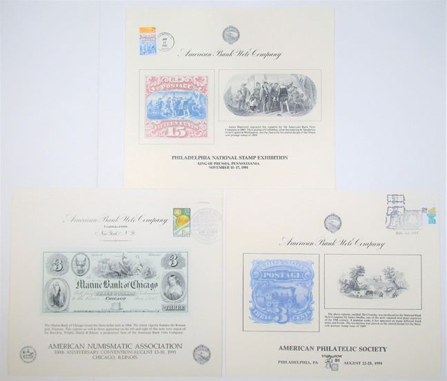 Pennsylvania & Illinois, 1991. Collection of Souvenir Cards from conventions and shows, Philadelphia National Stamp Exhibition, American Philatelic Society, & American Numismatic Association, Includes: US Postage 15 Cent stamp featuring the Landing of Columbus, issued in 1869 (5); US Postage 3 Cents stamp featuring locomotive from "The Crossing" engraving, issued in 1869 (5); Marine Bank of Chicago $3 Note, Issued in 1864 (5). All certificates have stamp at top corners, XF-AU condition. (15 pieces total). Sold "AS IS" no returns accepted.