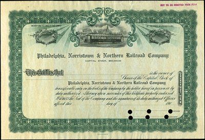 Philadelphia, PA. 19--(ca. 1900-1920). Specimen. 2 different stock certificates. 1). Philadelphia Railways Co., Odd shs, Capital Stock, orange. Vignette of interurban street car. Unlisted railroad in Cox. 2). Philadelphia Rapid Transit Co. < than 100 shs, Preferred, orange. Double decker bus flanked by 2 different interurban trains. SBNC. XF.
