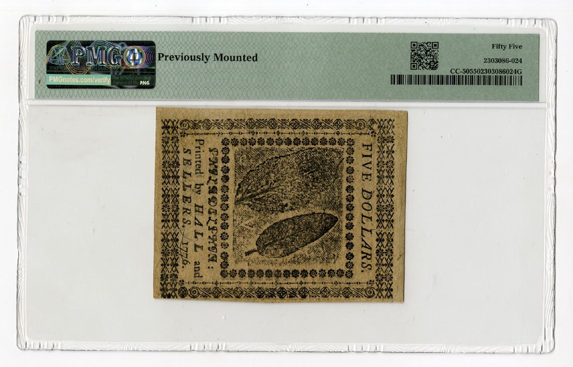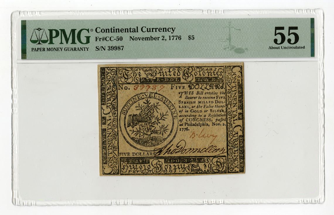 United States of America, 1776. $5, P-S150 Fr#CC-50, Issued Banknote, Black printing with S/N and signature in red ink and brown ink, Emblem on the front shows a bleeding hand in a thorn bush with the motto: SUSTINE VEL ABSTINE (the B is an H modified to from a letter B), S/N 39987, PMG graded About Uncirculated 55 with comment "Previously Mounted", Hall and Sellers.