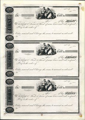 18--, (ca.1837-43). Proof sheet of 3 bills of exchange printed on india paper and mounted on thin white card. Allegorical vignette of 2 seated women on middle top and 2 cameo soldiers with helmets on left. Printed by UBSH, Philad & NY. Name of company and corresponding banks are left blank. Light glue stains where mounted on card in 6 areas, otherwise appears XF. Rare proof exchange by early ABNC predecessor company. UBSH.