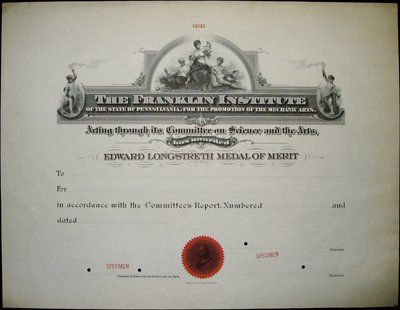 1880-1900's. Certificates. Specimen certificate. Attractive 14.5 by 18.5 inch certificate. Punch cancelled with red "Specimen" overprints. Vignette of long ornate title with cherubs on left and right with 2 allegorical women and an allegorical man in middle and red profile of Franklin at bottom. "The Franklin Institute of the State of Pennsylvania, for the Promotion of the Mechanic Arts, Acting Through its Committee on Science and the Arts, has Awarded the Edward Longstreth Medal of Merit". VF condition with light toning on edges. ABNC.