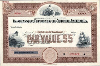 ca.1890's-1900's. 100 Shs. Specimen stock certificate. Allegorical woman with large gear and steamship on top, allegorical woman looking out to sea on left and schooner under full sail on right. Brown-red border. Red specimen overprints, POC's and "00000" serial numbers. XF condition. Scarce insurance company stock. ABNC.