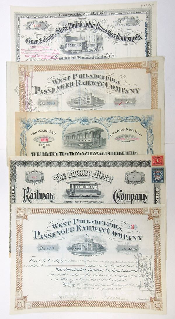 Philadelphia, Pennsylvania. Lot of 5 I/C Stock Certificates, Each are for a different Pennsylvania based railroad line including (2) West Philadelphia Passenger Railway Co.; an attractive 1932 Chester Street Railway Co.; Electric Traction Company of Philadelphia and others, Ranging from Fine-VF condition, 5 Pieces.