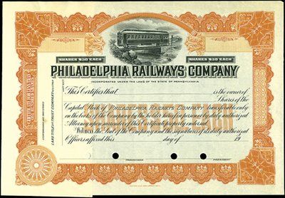 Philadelphia, PA. 19--(ca. 1900-1920). Specimen. 2 different stock certificates. 1). Philadelphia Railways Co., Odd shs, Capital Stock, orange. Vignette of interurban street car. Unlisted railroad in Cox. 2). Philadelphia Rapid Transit Co. < than 100 shs, Preferred, orange. Double decker bus flanked by 2 different interurban trains. SBNC. XF.