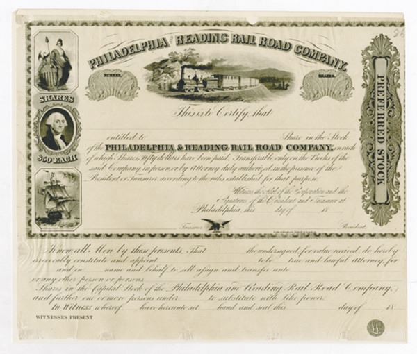 Pennsylvania. Proof Odd Shares Preferred Stock Certificate, Black print on black border, Printed on india paper mounted on thin card, Locomotive rounding curve at top with small image of Standing liberty, George Washington, and a ship at sea along left side margin, VF to XF with edge faults and glues stains in the corners and is mounted on cardstock, Hufty & Danforth. Possibly unique. This is the Cox Plate note.