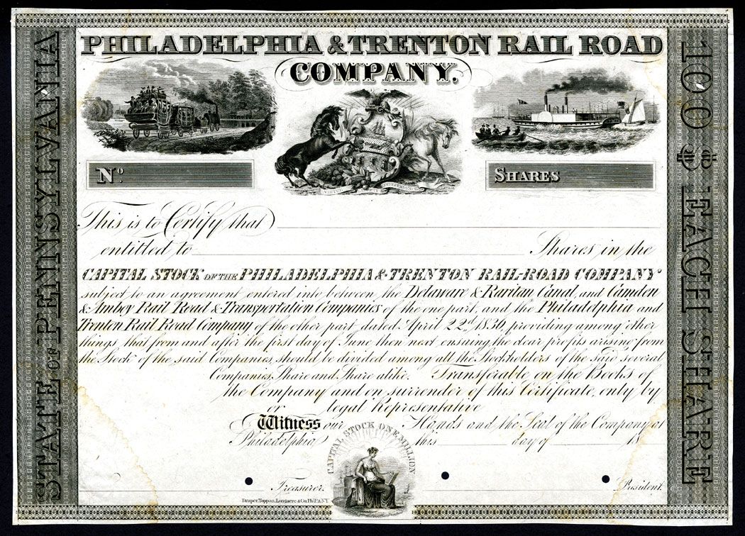 Philadelphia, PA, 1836, Odd Shares for $100 each, Proof printed in black on india paper, PA state arms in middle flanked by steamboat and old fashioned train, Text states "Delaware & Raritan Canal and Camden & Amboy Rail Road & Transportation Companies of one part and P&TRR ...stockholders of the said several companies Share and share alike". Evidently this was a merger between the railroads. Historic certificate. Appears VF to XF but it was evidently removed from previous mounting and there are light stains on the corners. Unlisted earlier date, design and certificate in Cox. Possibly unique. DTL.