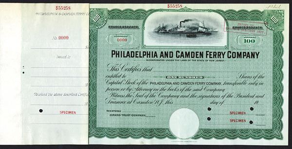 New Jersey. 100 Shares Specimen Capitol Stock. Black ink with green under print and border. Vignette of a ferry and harbor scene on top of certificate. Specimen overprints, POC's, XF, ABNC.