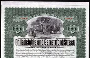 Pennsylvania, 1905, $1,000. Mortgage bond. Green border with street car next to horse frwan buggy with pedestrians watching. ABNCo. Specimen with coupons, XF, Listed railroad, unlisted as bond in Cox, only as a stock.