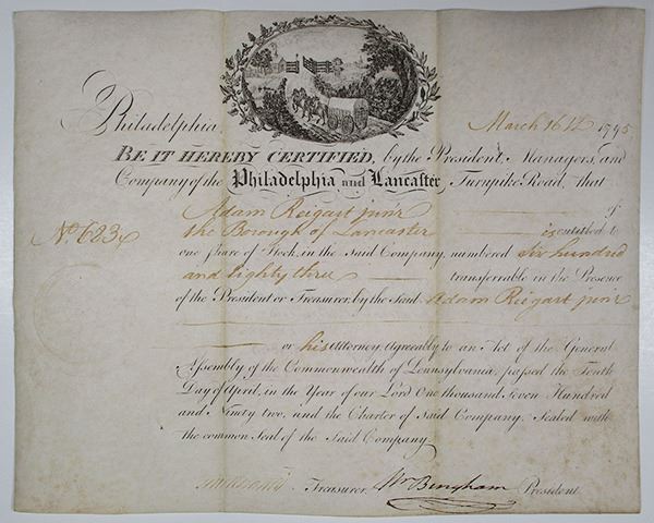 Pennsylvania, March 16, 1795. 1 share, I/U, No. 319. Signed William Bingham, uncancelled. VF condition with strong autograph. Printed on vellum paper. William Bingham (March 8, 1752 – February 7, 1804) was an American statesman from Philadelphia. He was a delegate for Pennsylvania to the Continental Congress from 1786 to 1788 and served in the United States Senate from 1795 to 1801.