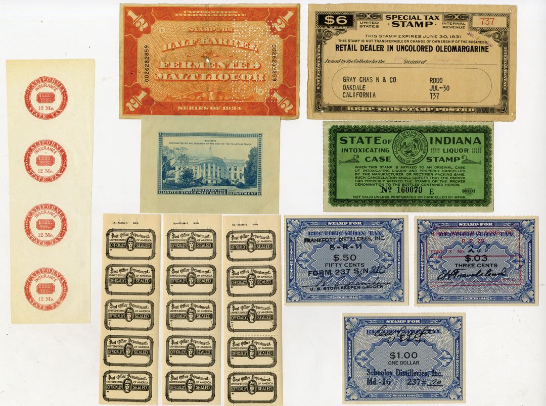 Washington, D.C....., Indiana, California, and others, 1930-40s. Lot of 11 Pieces, Includes: 1930, $6 Special Tax Stamp for Uncolored Oleomargarine; ca. 1930s, State of Indiana stamp for Intoxicating Liquor; 1946, Rectification Tax Stamps (3); Stamp for 1/2 Barrel of Fermented Malt Liquor; ca. 1920-30s, USPS, Souvenir from Philatelic truck; ca.1850-60s, Uncut sheet of 4 California Insurance State Tax; ND (ca.1890-1920s), 3 sheets of Post Office Department, US "officially sealed" stamps. Items range from VF to Unc. condition. (11). Sold "AS IS" no returns accepted.