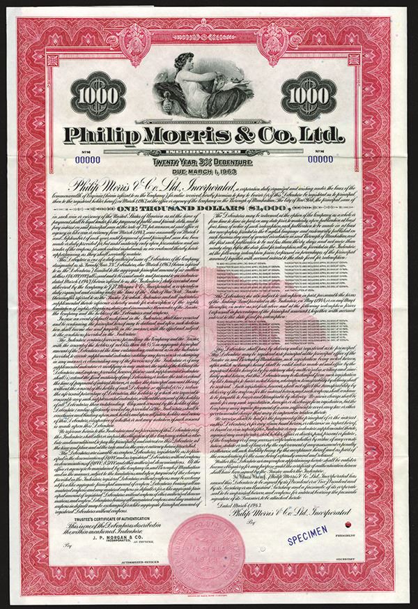 Virginia. $1000 Specimen 3% Debenture Coupon Bond. Black ink with pink/red border and under print. Vignette of allegorical figure at top center. All coupons still attached. Specimen overprints, POC's, VF, ABNC.