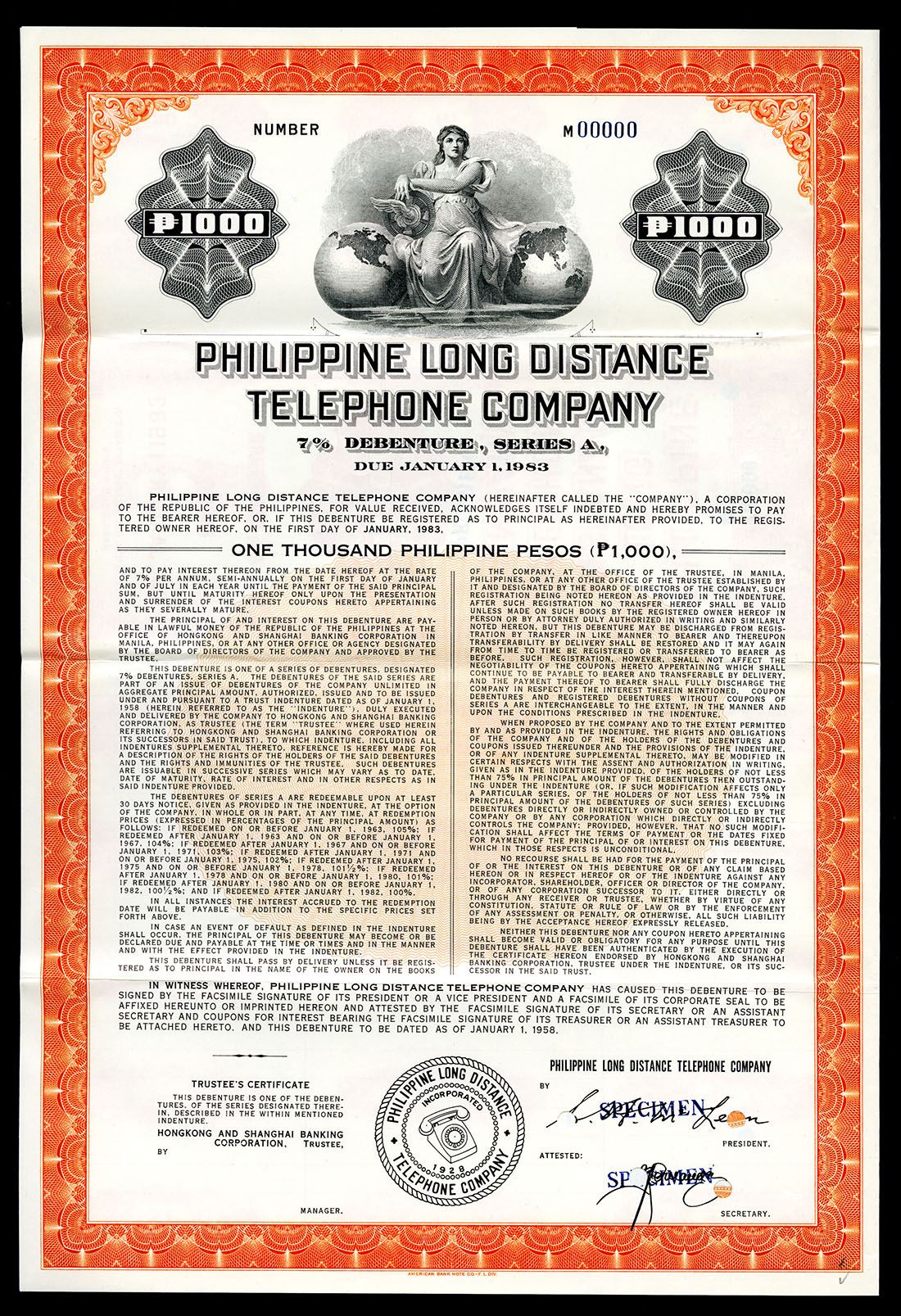 Philippine. 1958. 1000 Pesos 7% Specimen Bond with coupons attached. Black print with orange border and underprint. Vignette of allegorical woman top center flanked by two globes. POC's and blue SPECIMEN overprints. VF-XF condition. ABNC.
