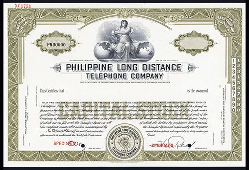 Philippines, 19xx, Specimen Stock, Black on green border and underprint, Vignette of allegorical woman flanked by two globes with different views of earth, VF-XF condition, Franklin-Lee ABNC.