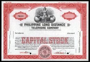 Philippines. ND (ca.1940-50's). Odd Shares, Red border with allegorical woman sitting between two globes holding winged wheel. Specimen, POC's, XF condition. Scarce Philippine telephone stock. FLD-ABNC.