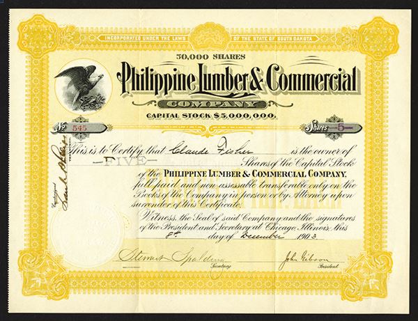 Philippines, 5 Shares, I/U, Black on yellow undertint and border, Eagle on top left, Corporate offices located in Chicago. XF condition with original envelope it was stored in.