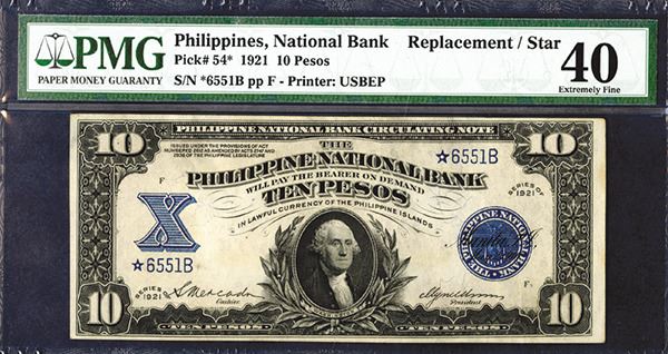 Philippines, Series of 1921, $10, P-54. Issued banknote., George Washington in middle, Blue seals, back brown, S/N *6551B, PMG graded Extremely Fine 40, Scarce low serial number star note. BEP.