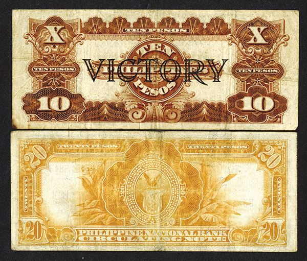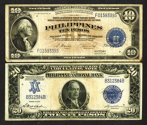Philippines. 10, 20 Pesos. P-55, 97. The 10 with stain at bottom right; the 20 with staple hole; Very Fine. 2 pieces.