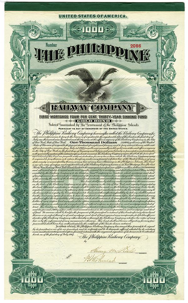 Philippine, $1000, 4% Gold Coupon Bond, I/U, Eagle on top, black on green, no coupons left, International BNC.