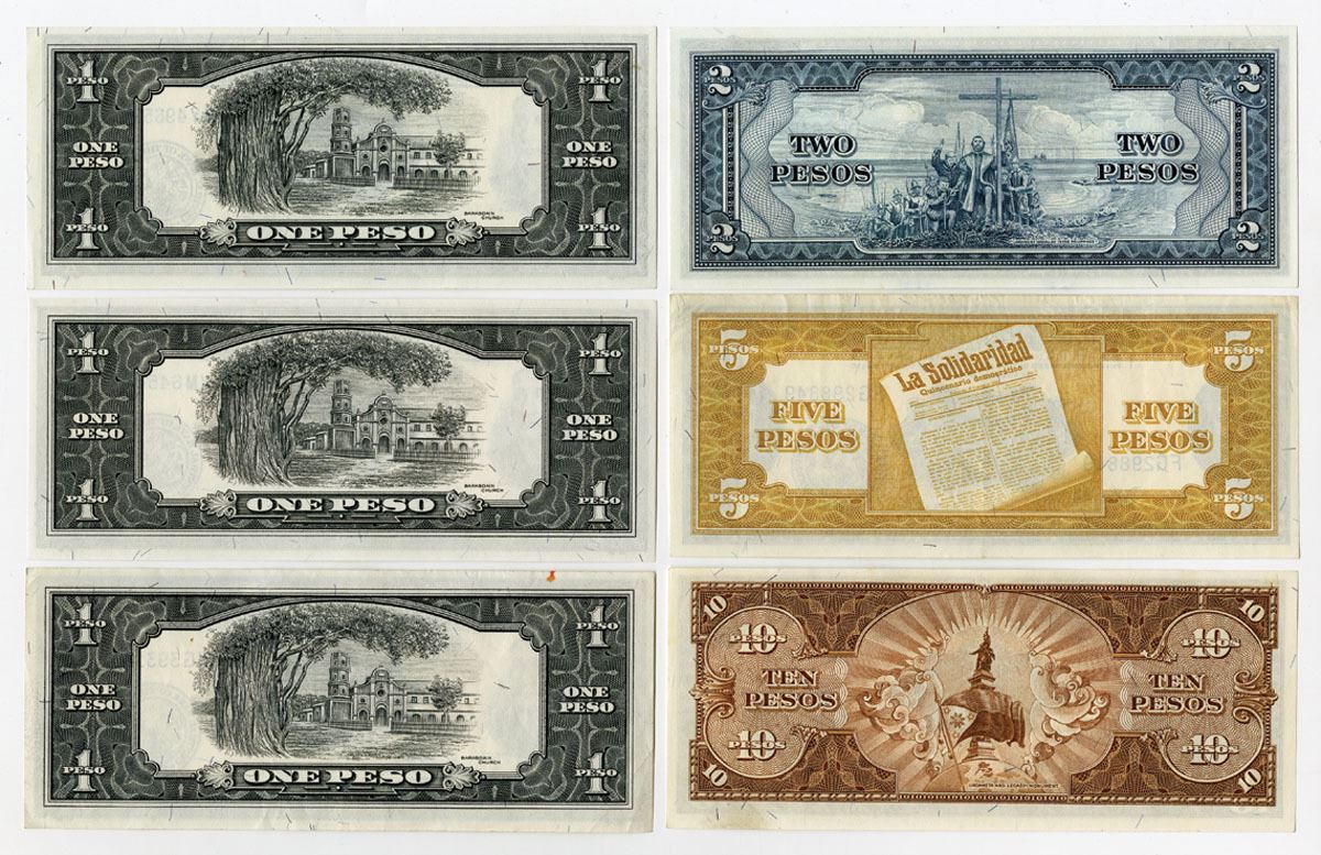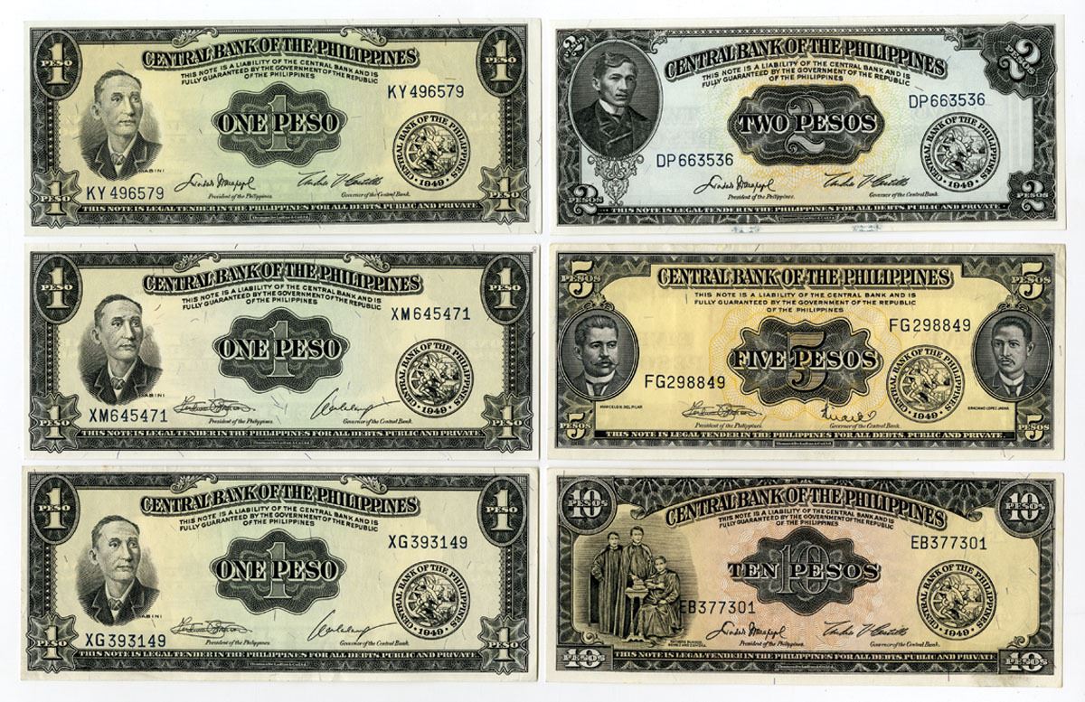 Philippines, 1949. Collection of Issued Banknotes, Includes: 1 Peso, P-133f & P-133h (2); 2 Pesos, P-134d; 5 Pesos, P-135f; 10 Pesos, P-136e. Notes are XF-AU condition. (6).