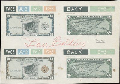 1953. P-Unlisted. 50 Centavos. Proof. Sheet of 4 color trial front and backs of banknotes with fronts on left and backs on right. Each note has color registration bars on top of it. All are dated 2-20-53/Revised 3-20-53 on upper left and right margin of each note. All of the notes are different colors. All are Unc. Front has vignette for "Maria Cristina Hydroelectric Plant" back has "Maria Cristina Fertilizer Plant". 2 fronts with different color schemes. Rare format. SBNC. Uncirculated.