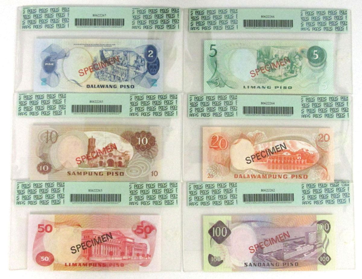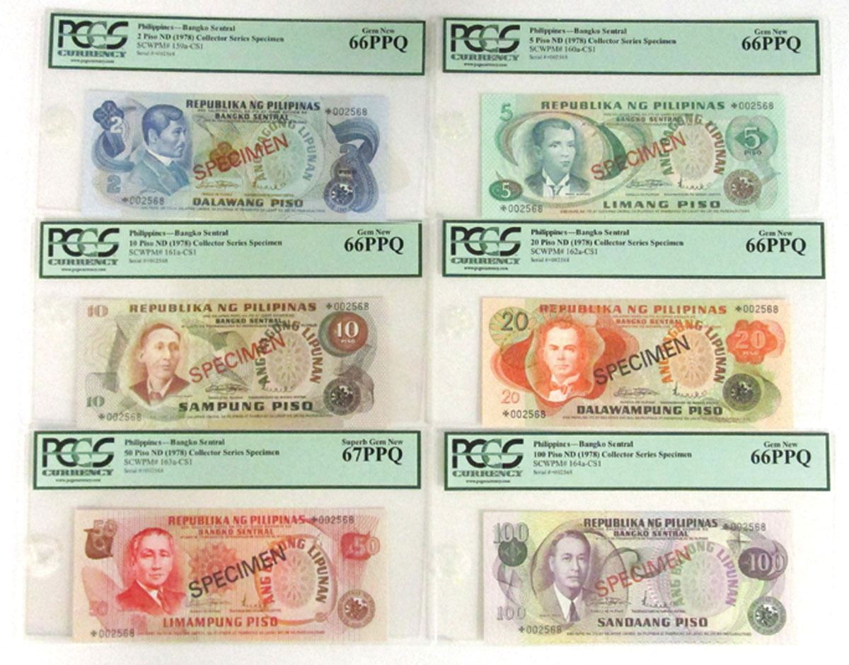 Philippines, ND (1978). Lot of 6 Collector Series Specimen Banknotes, Includes: 2 Piso, P-159aCS1, S/N *002568, PCGS graded Gem New 66PPQ; 5 Piso, P-160aCS1, S/N *002568, PCGS graded Gem New 66PPQ; 10 Piso, P-161aCS1, S/N *002568, PCGS graded Gem New 66PPQ; 20 Piso, P-162aCS1, S/N *002568, PCGS graded Gem New 66PPQ; 50 Piso, P-163aCS1, S/N *002568, PCGS graded Superb Gem New 67PPQ; 100 Piso, P-164aCS1, S/N *002568, PCGS graded Gem New 66PPQ. All have Specimen overprints and printed by G&D. (6). Sold "AS IS" no returns accepted.