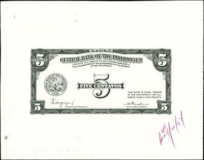 ND 1949. P-125 Unlisted. 5 Centavos. Proof. Approval front & back large die proofs printed on white glossy paper. Unique. SBNC. Uncirculated.
