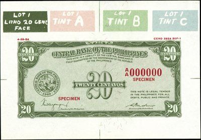 ND 1949. P-129 Unlisted Trial Color. 20 Centavos. Proof. Front & back trial color proofs of design. Top margin has color registration bars. Olive green on light green undertint. Dated 4-28-54. Printed on banknote paper. Paper clip mark on top of front banknote. SBNC. AU.