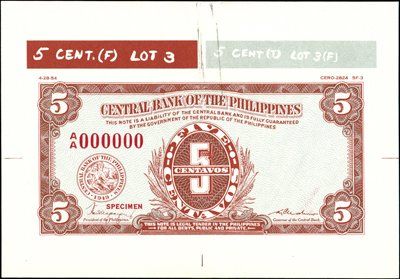 ND 1949. P-Unlisted. 5 Centavos. Proof. Front & back proofs of proposed essay design. Back has man hacking coconuts in half. Never issued design. Top margin has color registration bars. Brown on light blue undertint. Back has watermark of male profile. Dated 4-28-54. SBNC. AU.