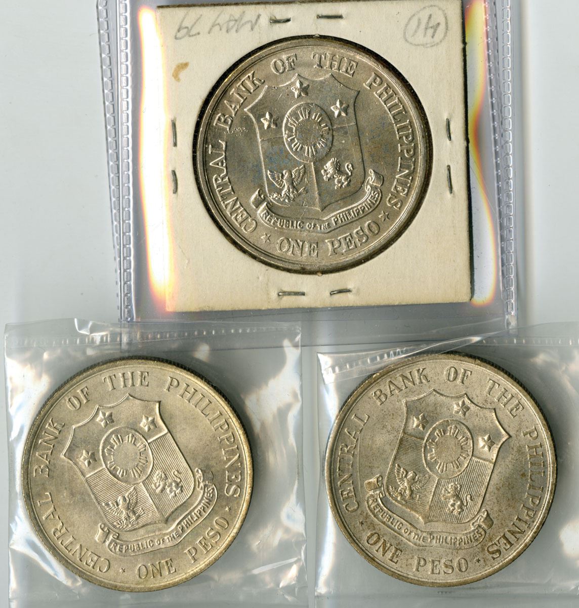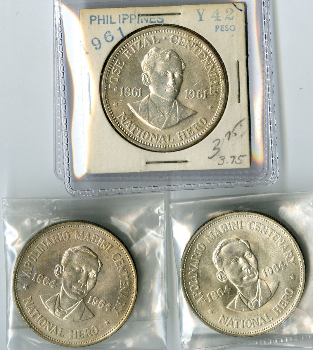 Philippines, 1961-64. Lot of 3 issued silver Peso commemorative coins including one 1961 José Rizal Centennial Peso and two 1964 Apolinario Mabini Pesos. Obverses feature portraits of José Rizal and Apolinario Mabini, with the Philippine coat of arms and denomination on the reverses. Each coin is struck in .900 fine silver, weighing 26 grams, for a total weight of 78 grams and an actual silver weight (ASW) of 23.4 grams per coin, or 70.2 grams total (2.257 troy oz) of .999 silver. (3). Sold “AS IS” no returns accepted.