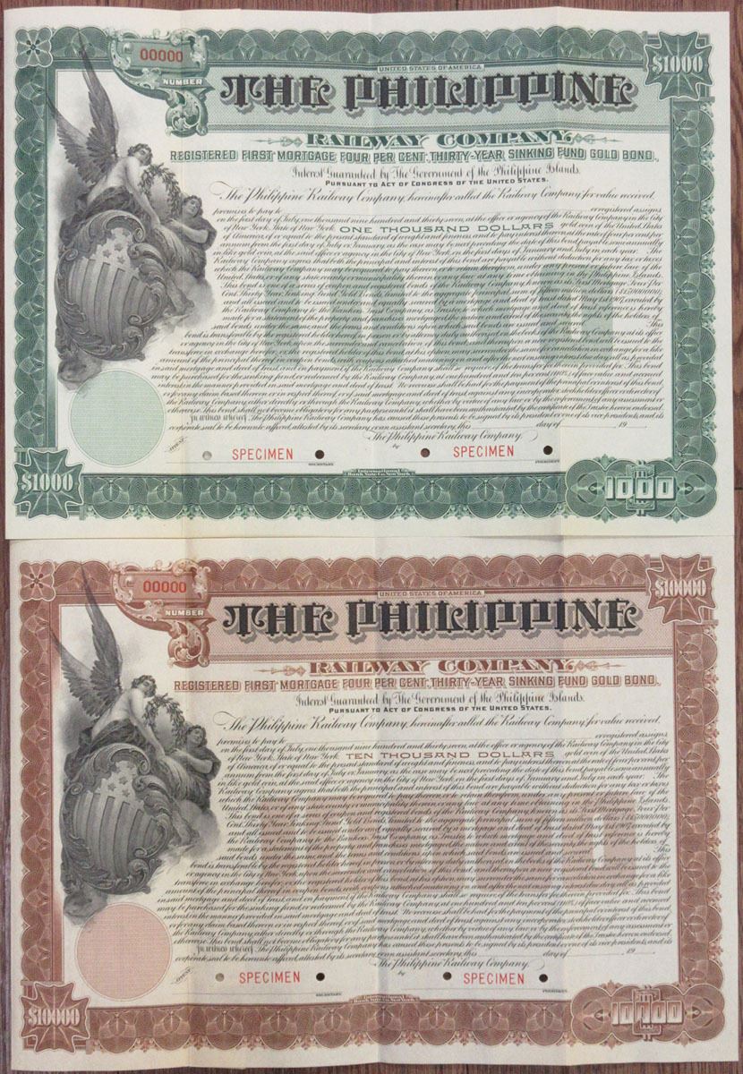 Philippines, 1907. Lot of 2 bonds, both are Specimen Registered 1st Mortgage, 4%, 30 Year Sinking Fund Gold Bond, Includes $1000, black on green border and underprint and $10,000, Black on Brown border and underprint. Both with same design of allegorical woman and angel at left with large American Stars and stripes shield. Both have red specimen overprints, "00000" serial numbers, and POCs. The bond is guaranteed by the Government of the Philippine Islands pursuant to an Act of Congress of the United States. Printed by IBC, VF-XF condition, both with counterfoil at left Unlisted railroad in Cox, Only 2 examples of each bond found in the ABN Archives and this is the only pair available. (2)