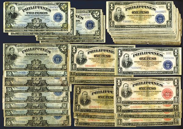 Philippines. 1 Peso P-81 (9 some with paper loss at ends or tape); P89a (2); P-94 (17 many with rust stains, graffiti or other issues); 2 Pesos P-95a (14). Generally Good or so, with the issues associated with the grade. 42 pieces.