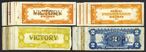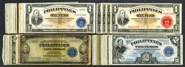 Philippines. 1 (27), 2 (13), 5 (9) Pesos. Quite the variety of types, many with the VICTORY overprint. Red and blue seals represented. Some with tone or rust. Good to Very Good a few better. 49 pieces