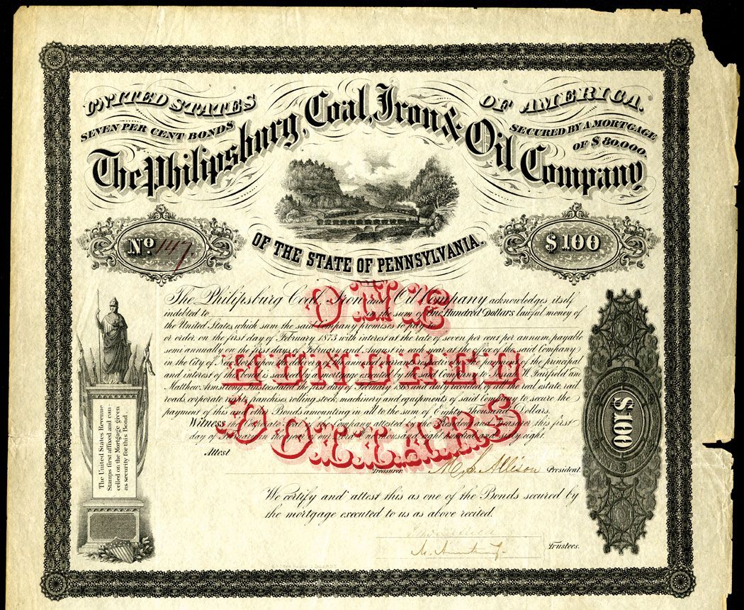 Pennsylvania, $100, 7% Mortgage Coupon bond, Small coal train top middle, Liberty at left, Fine condition due to edge faults away from border. Scarce early oil and coal company bond.