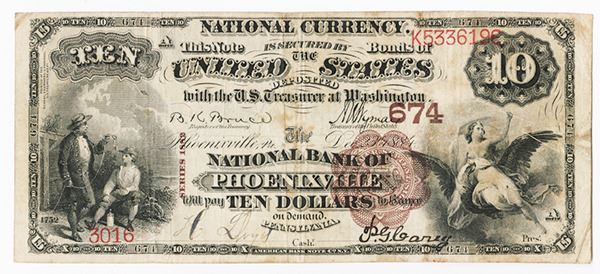 Phoenixville, PA. $10, 1882 BB, S/N K533619 - 3016, Bruce | Wyman Signatures, VF condition with toning in middle, 4 ample to large margins, sharp corners and firm paper body. 16 large size notes are known on this bank, This is the only $10 BB denomination listed for this bank. Desirable and attractive banknote.