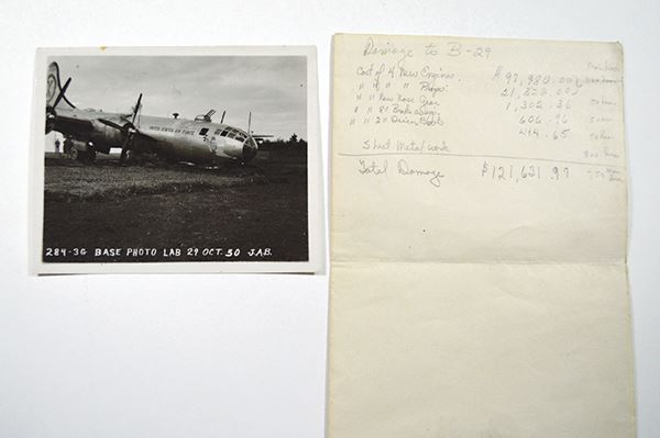 J.A.B. 5x4 Base photo of B-29 46854 (nose art Southern [ ]), with estimate of damage costs and man hours to repair. Neat.
