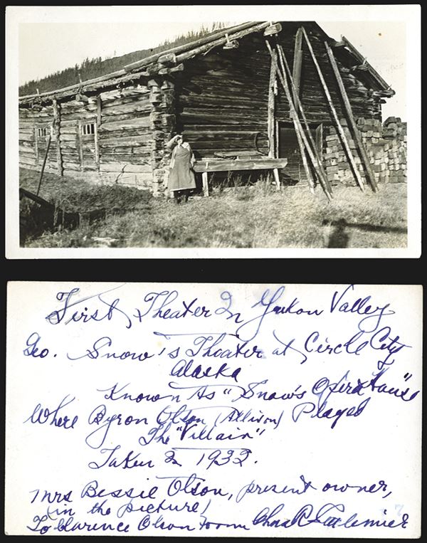 Circle City, Alaska, 1932, Real photograph of George Snow's Theater (aka "Snow's Opera House") at Circle City, Alaska, image of Mrs. Bessie Otson, owner of the theater standing in front of the log cabin theater. XF condition. Early Alaska photo.