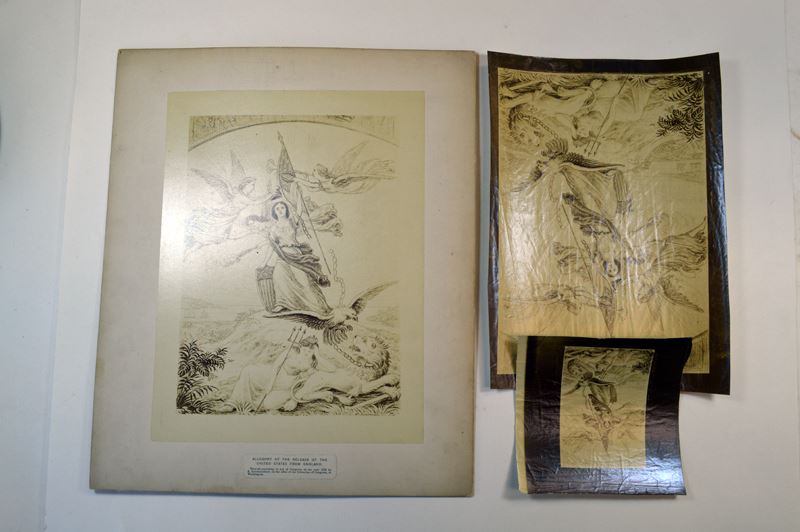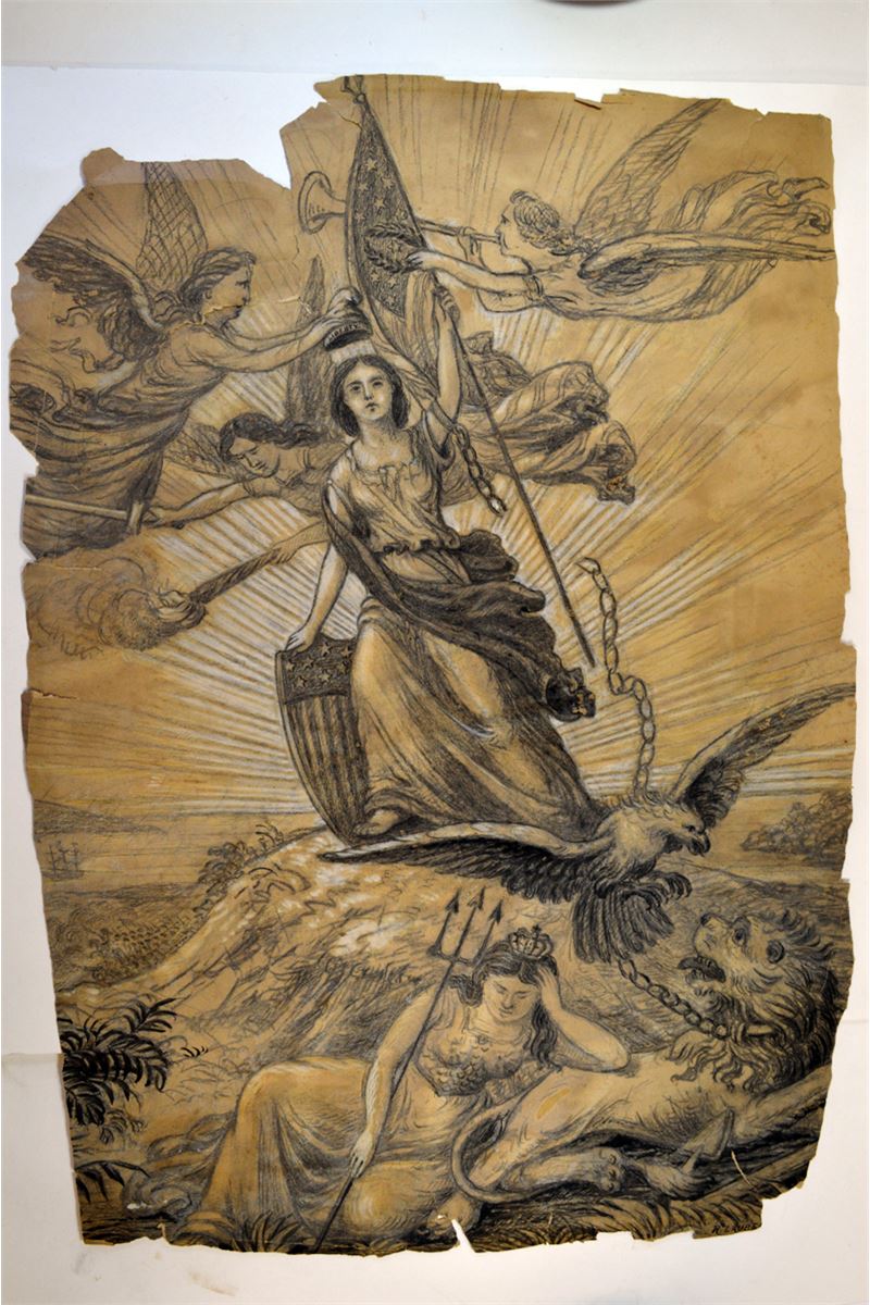 Pencil and charcoal drawing of America triumphant over Great Britain. Done for 1876 exposition. Large sheet, fragile with paper loss affecting design elements. Signed R. Laube[nheimer]. Along with three photographic reductions, two 6-3/8x9 (one mounted) the other 4-3/8x4-1/4 showing the same image. 4 pieces.
