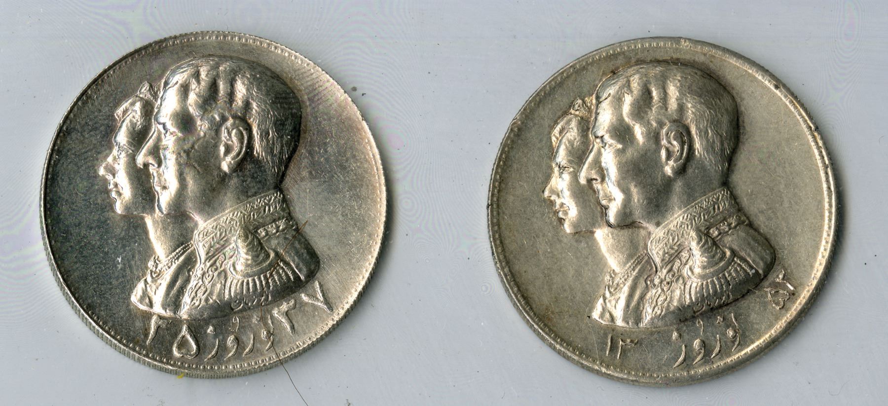 Muhammad Reza Shah, 1941-1979. Lot includes three (3) silver Nowruz medals of the Physical Education Organization of Iran, dated SH1337 and SH1352. 37mm. Obverse features conjoined busts of Muhammad Reza Pahlavi Shah and Queen Soraya, nowruz flanked by date below. Reverse depicts a polo player riding right, swinging club at ball behind, mosque in background, all within laurel wreath, sazaman-e tarbiyat-e badani-ye Iran (______ _____ ____) below, light hairlines, XF. (3)