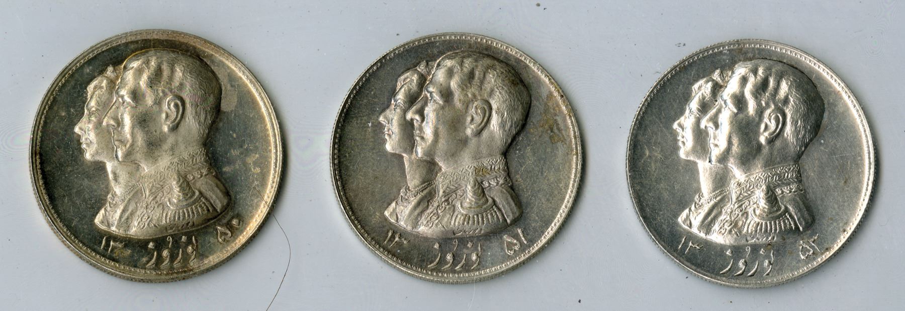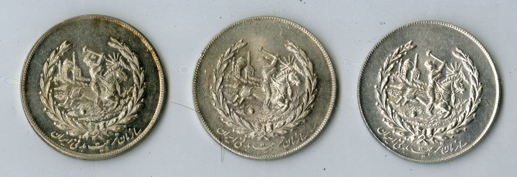 Muhammad Reza Shah, 1941-1979. Lot includes three (3) silver Nowruz medals of the Physical Education Organization of Iran, dated SH1350, SH1351, and SH1353. 37mm. Obverse features conjoined busts of Muhammad Reza Pahlavi Shah and Queen Soraya, nowruz flanked by date below Reverse depicts a polo player riding right, swinging club at ball behind, mosque in background, all within laurel wreath, sazaman-e tarbiyat-e badani-ye Iran (______ _____ ____) below, light hairlines, XF. (3)