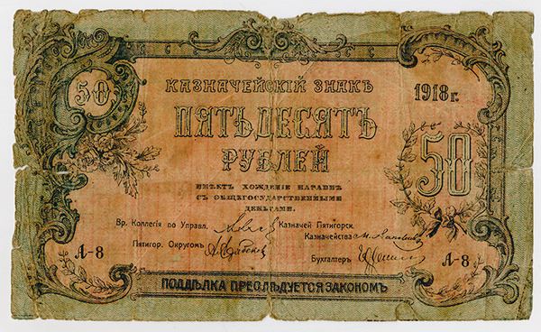 Piatigorsk, Southern Region, Russia. Issued 50 Ruble exchange token, 1918, series A-8. Not listed in the Standard Catalog of World Paper Money. Very Good to Almost Fine condition and very rare.