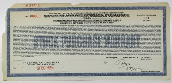 Italy, 1926. 30 Shares Specimen Stock Purchase Warrant, Black text with blue border and underprint. Red specimen overprint, 00000 serial number, and POCs. Fine condition with some damage to margins, ABNC.