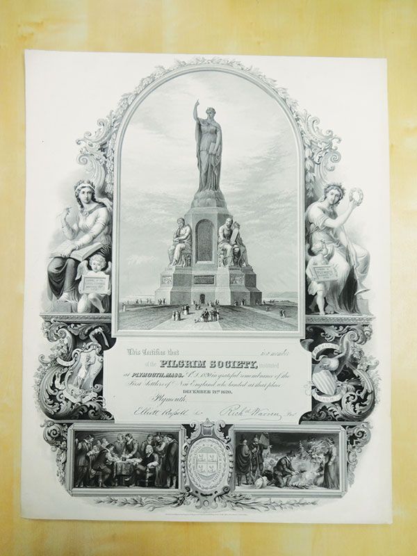 Plymouth, Massachusetts. 1820. Unissued membership certificate. Black print with black underprint. Large monument by the ocean in center flanked to either side by allegorical women with cherubs, Massachusetts State seal on left with Plymouth seal bottom center, Scenes of Pilgrims in Plymouth bottom left and right. VF condition. Engraved by Rawdon, Wright, Hatch & Edson New York.