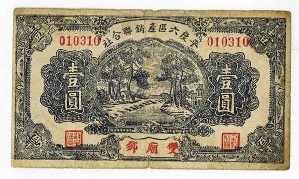 Shandong Province, China. A local currency of 1 yuan issued by the Communist government in 6th District of Pingdu County, Shandong Province in 1942. The main image on the front side is a countryside view. The serial number is 010310 and the red imprint on the bottom is the name of Shuangmiao Town. Seals are of the managers. The back side shows instructions, date and a seal of the Farmers Cooperation. _______1942_____________________________________________010310____________________________________