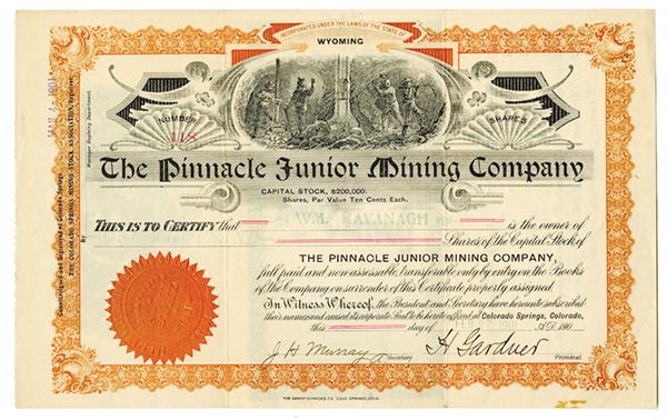 Wyoming, 1901. 1000 Shares I/U Capital Stock Certificate, Black text with orange border, Men at work in mine at top center. Fine condition with small stain at bottom right corner, small staple holes at top center. The Pinnacle Junior Mining Company operated mines in Colorado Springs.