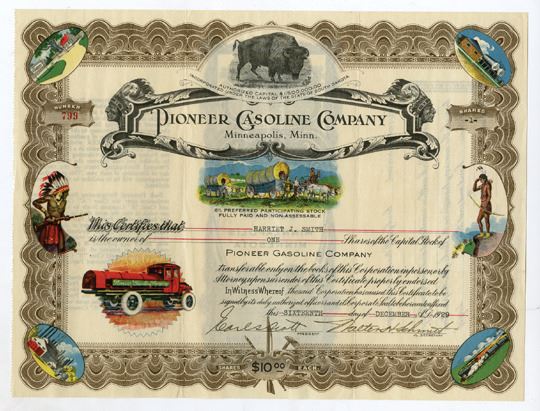 Minneapolis, Minnesota, (Inc. in SD), 1929. Pioneer Gasoline Co., 1 Share I/U Capital Stock Certificate, Black on brown border, Multiple colorful and black and white images cover the certificate including a buffalo at the top center, covered wagon train in the middle native Americans on the left and right with a tanker truck at the bottom left with additional vignettes in the 4 corners, Other dealers are offering this exact type of certificate for over $2000, S/N 799, VF-XF. This is the first example we have had the privilege to offer at auction.