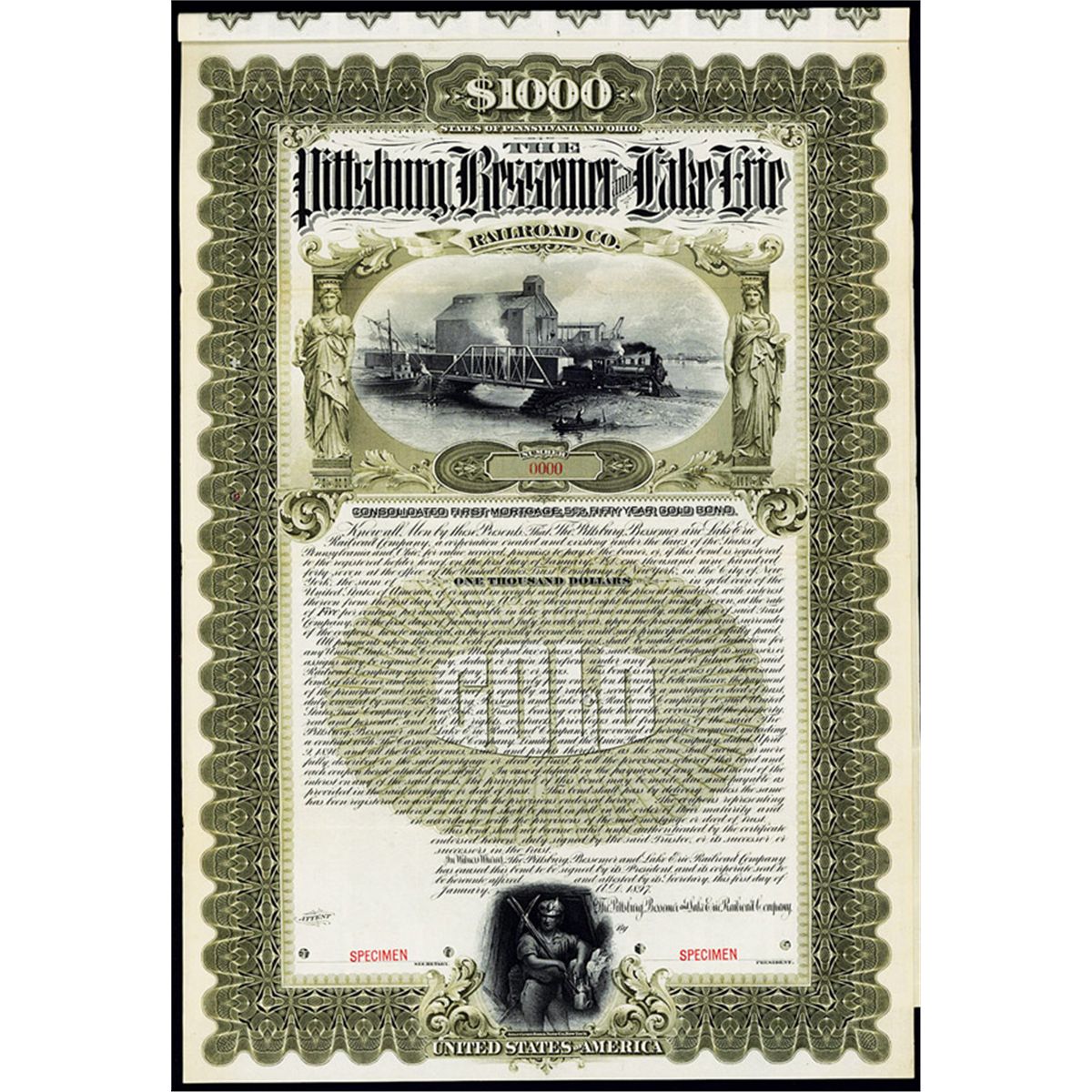 Ohio, 1897, $1000, Specimen, Consolidated 1st Mortgage 5% Gold bond. Black with Olive-green borders and underprint, Locomotive over bridge with boats in front and large building in back on top and miner on bottom. XF condition. Red specimen overprints, POC's and “00000 “ serial numbers. Coupons attached. Rare Ohio and Pennsylvania railroad that is listed in Cox but this is an unlisted bond design and type. Extremely attractive and ornate. ABNC.