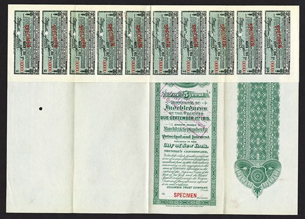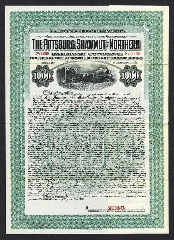 Pennsylvania, 1902, $1000, 1st Mort. 5% Gold Bond, Series A, Black on red-plum, locomotive L-R leaving station on top with miners on bottom, coupons attached, POC's, XF condition, Another rare and attractive bond that is unlisted in Cox. ABNC.