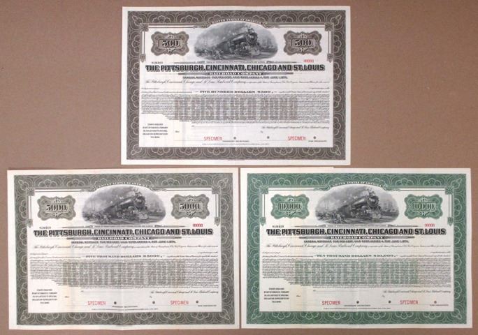 Pennsylvania, Ohio, West Virginia, Indiana & Illinois, 1920. Lot of 3 Specimen Registered 5% Gold Bonds in varying colors and denominations: $500 in brown, $5000 in gray/green, and $10,000 in green. All have Specimen Overprints, POCs, are in VF to XF condition, ABNC. (3). Sold "AS IS" no returns accepted.