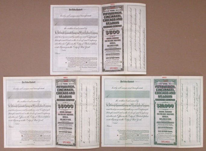 Pennsylvania, Ohio, West Virginia, Indiana & Illinois, 1920. Lot of 3 Specimen Registered 5% Gold Bonds in varying colors and denominations: $500 in brown, $5000 in gray/green, and $10,000 in green. All have Specimen Overprints, POCs, are in VF to XF condition, ABNC. (3). Sold "AS IS" no returns accepted.