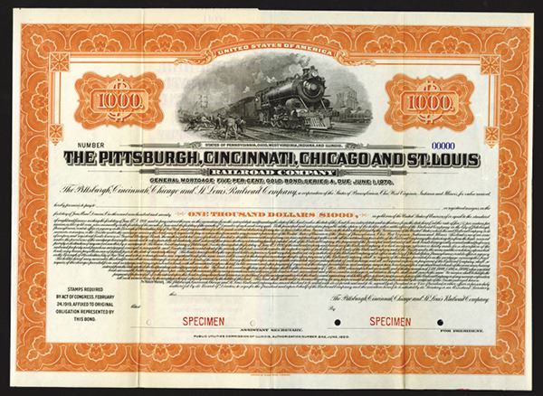 Pennsylvania, Ohio, West Virginia, Indiana, and Illinois. $1000 Specimen 5% Series A General Mortgage Gold Registered Bond, Black print on large orange border and under tint, Locomotive at top passing men repairing tracks, Specimen overprints and POC's, VF-XF condition, ABNC.